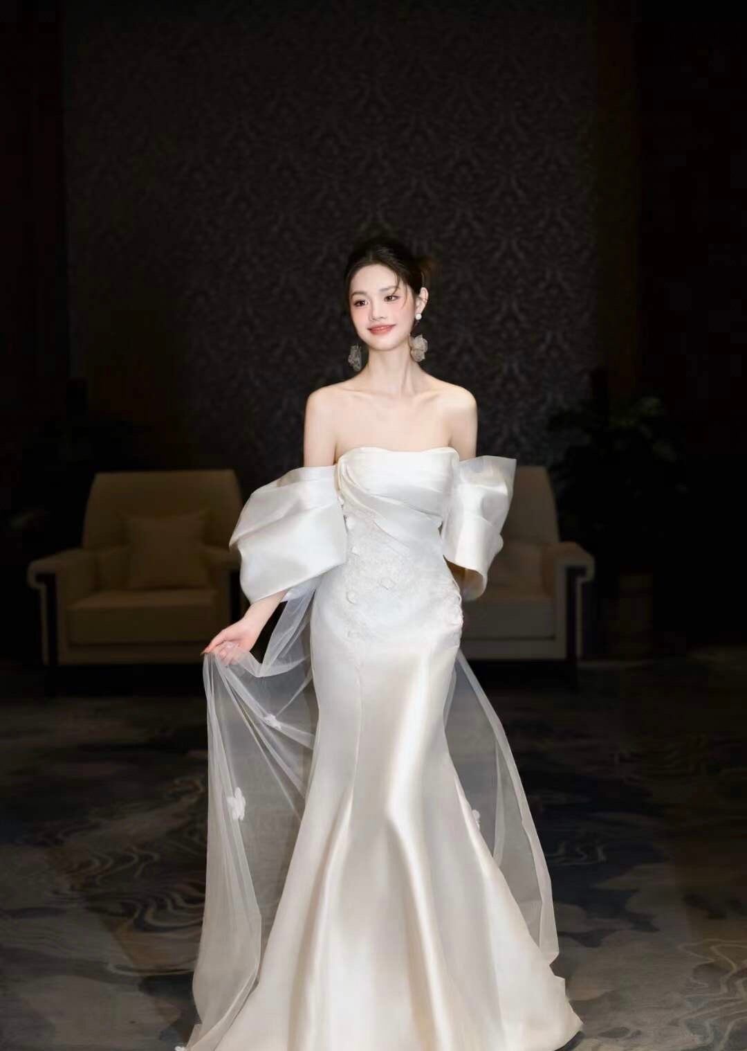 人気のオフショルダーをサテン生地でお作りしています。マーメイドで大人な雰囲気です。