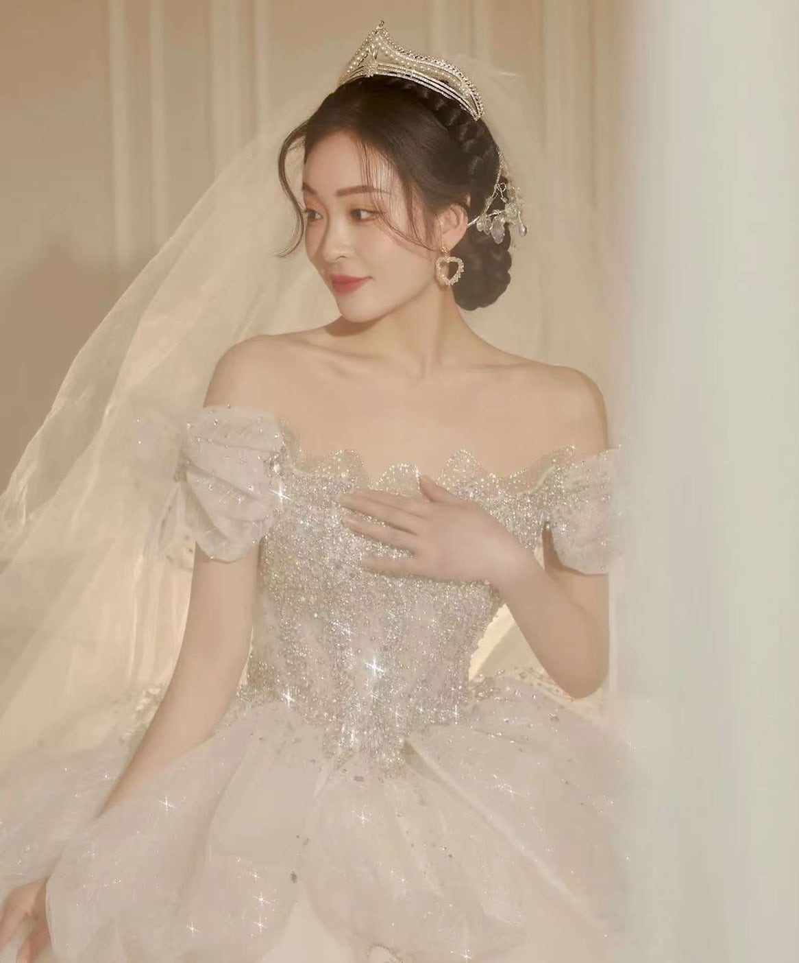 オフショルダー にパフスリーブのついたドレスになります。ビジューがふんだんにあしらわれている、かなり存在感のあるドレスです。