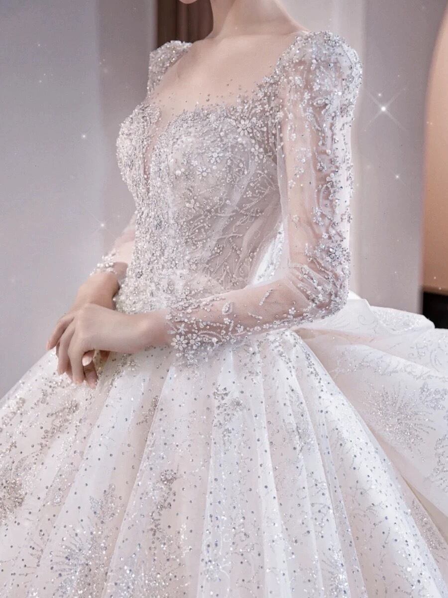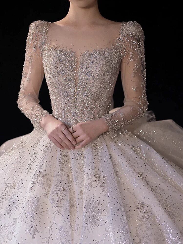 ビジューがふんだんにあしらわれているプリンセスドレスです。かなり存在感のあるドレスです。