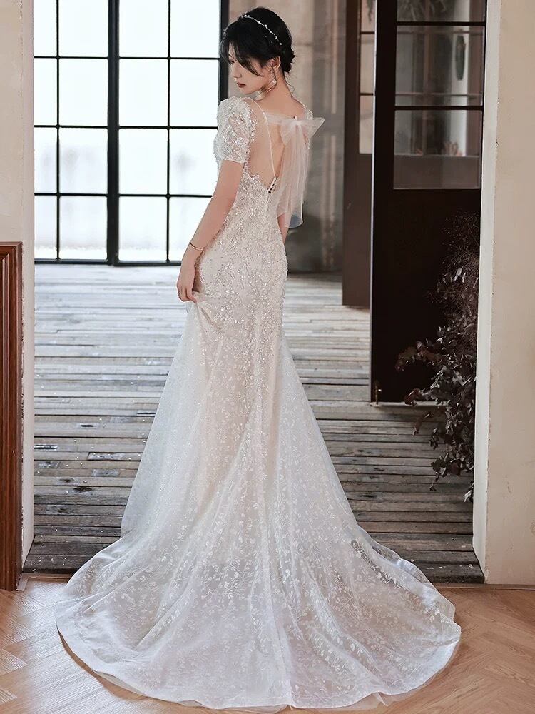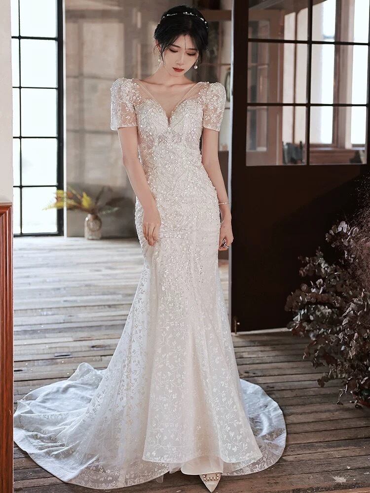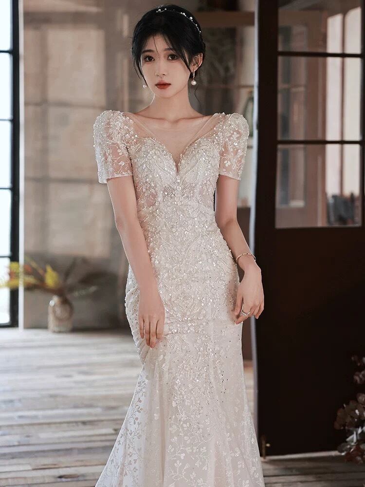 キラキラ生地ドレスをマーメイドシルエットで大人な雰囲気に仕上げています