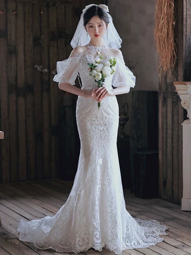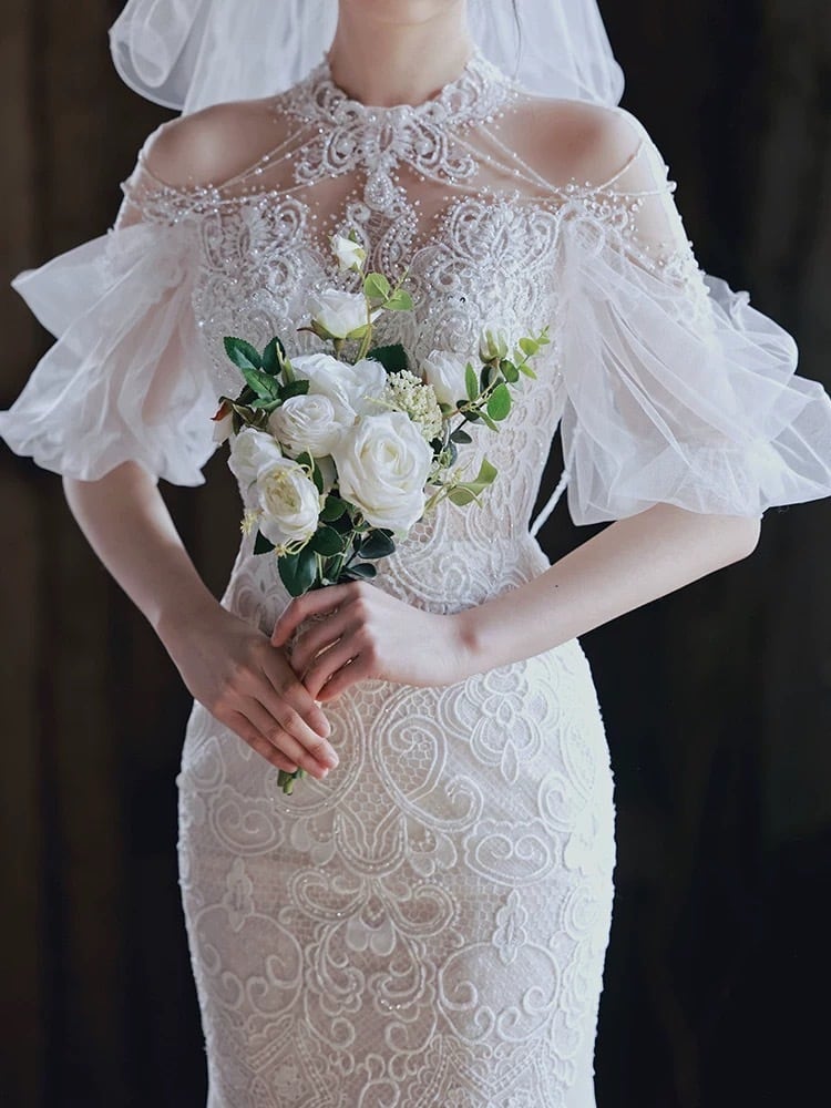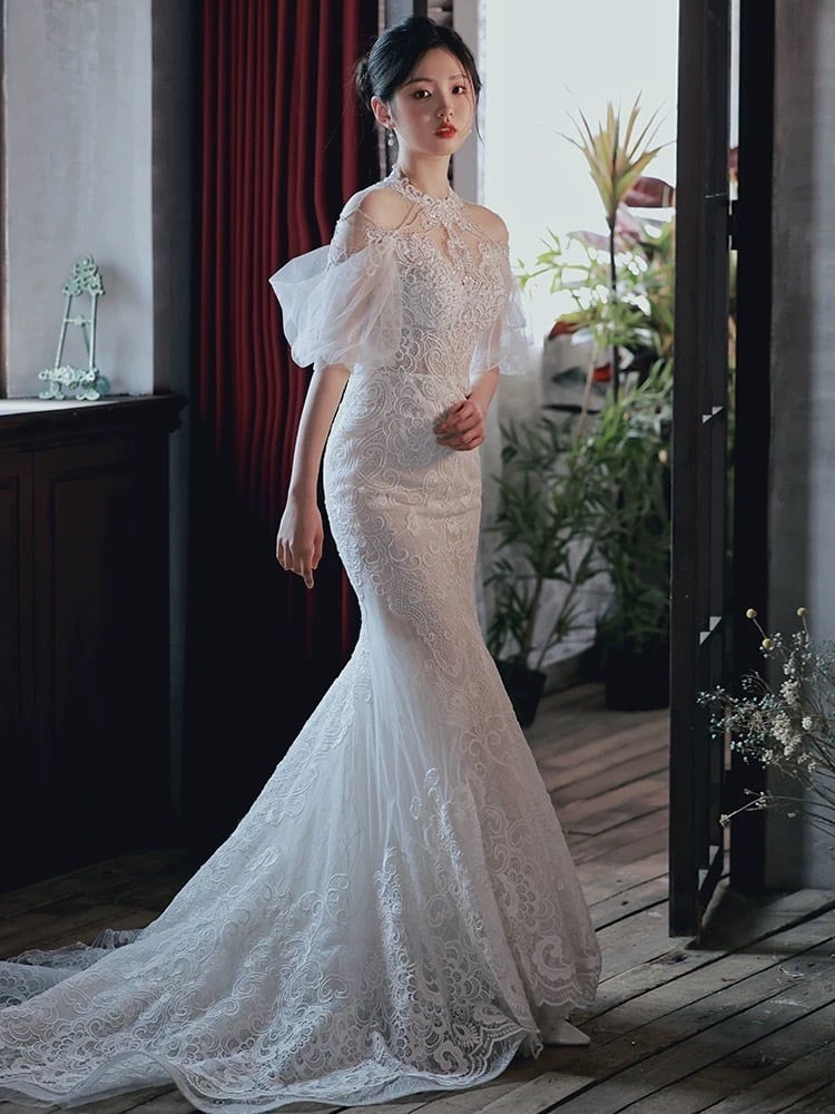ホルターネック 半袖 パール レース マーメイドドレス P016